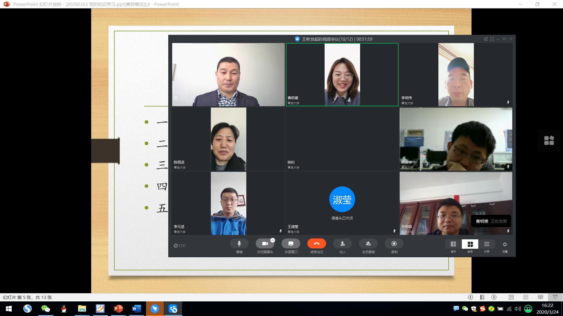 19日上午,通信工程系黨支部以“擔當作為、狠抓落實”為主題,針對通信工程系畢業生考研就業、專業認證報告進展及線上教學等情況進行總結,組織老師們交流討論。分析疫情對就業的影響,分派畢業設計指導老師主抓所帶學生的就業,做好學生的思想工作、敦促學生積極面向社會,提高通信工程系的就業率。根據新版專業認證要求,針對教學大綱撰寫、2015級和2016級的試卷分析、課程目標分析等具體工作,通信工程系教師殷作亮積極發言,匯報他負責的材料收集工作的進展情況。與會教師還就如何布置線上作業、階段測驗、課堂互動等問題討論熱烈,互相分享線上教學經驗。