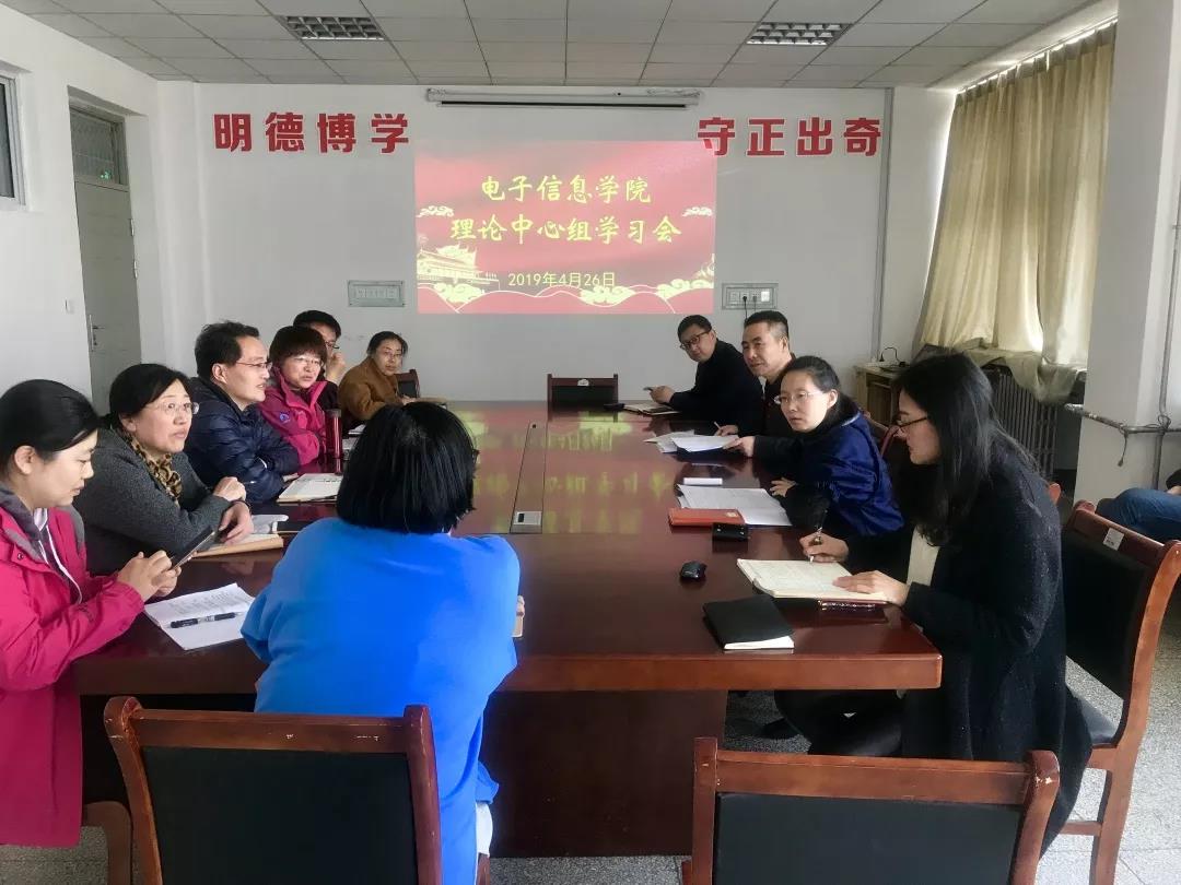 4月26日下午,電子信息學院在誠思樓407會議室召開黨委理論學習中心組(擴大)2019年第2次理論學習會。黨委書記苗洪麗主持會議,學院黨政領導、院長助理、各系黨支部書記、主任、副主任、科級干部及全體管理人員參會。
