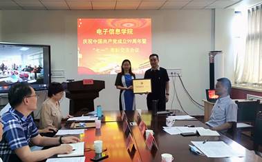 苗洪麗為“電子信息學(xué)院優(yōu)秀共產(chǎn)黨員”頒獎(jiǎng)