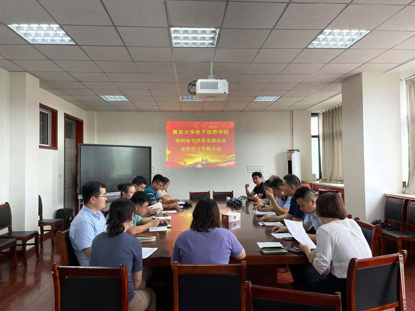 2021年9月5日中午,微納電子學系黨支部召開黨史學習教育專題組織生活會。會議在誠思樓407召開,由黨支部書記王彬主持,副院長宿杰出席會議,微納電子學系黨支部全體黨員教師參加會議。會議主要內容為交流暑期學習黨史心得。