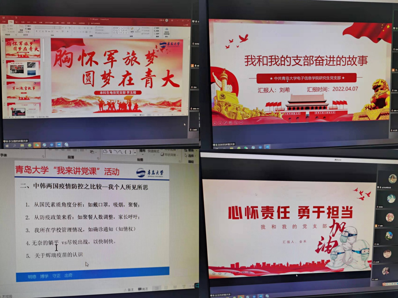 “我和我的支部”故事比賽環節,教師黨員許麗艷以“百年黨史催人奮進 教書育人不忘初心”為題,講述了通信工程系黨支部始終把立德樹人作為根本任務,在教學、科研以及服務學生中充分發揮了黨支部戰斗堡壘作用和黨員先鋒模范作用。教師黨員陳倩倩以“全心全意為學生服務”為題,講述了電子工程系黨支部在電子信息工程專業認證和一流本科建設方面所作的努力以及所取得的成績。教師黨員謝萬峰以“從國內外新冠抗疫對比談談我對黨的全面領導的再認識”為題,講述了自己在韓國學習生活三個多月的切身感受,充分彰顯了中國共產黨“以人民為中心”的發展思想。學生黨員劉希以“我和我的支部奮進的故事”為題,講述了研究生黨支部堅持團結、務實、創新理念,注重黨員日常管理、教育和培訓,嚴格執行發展黨員工作制度。學生黨員李玉楷以“胸懷軍旅夢,圓夢在青大”為題,講述了自己作為青島大學國旗班護旗隊員和2020級新生軍訓教官,在校園實現軍旅夢的責任和擔當。學生黨員金禾以“心懷責任,勇于擔當”為題,講述了封??箵粢咔槠陂g本科生微納黨支部依托紅色云展廳,堅持開展“上黨課、話黨史、感黨恩”主題實踐活動。