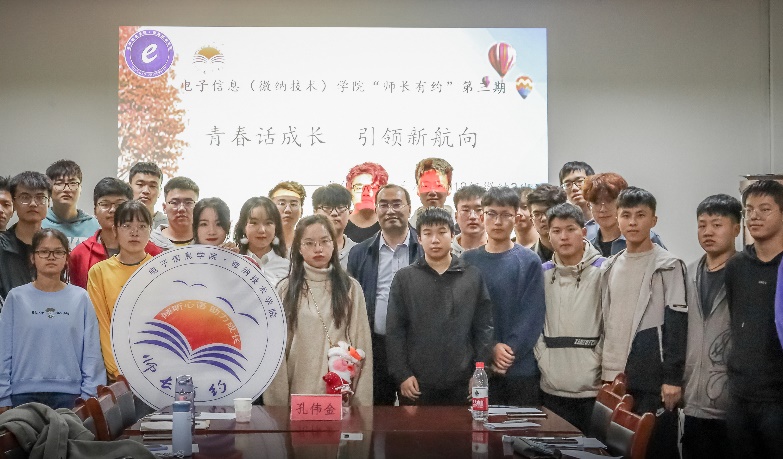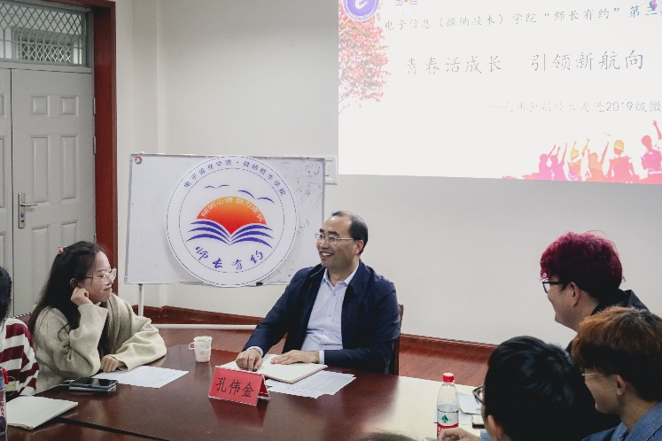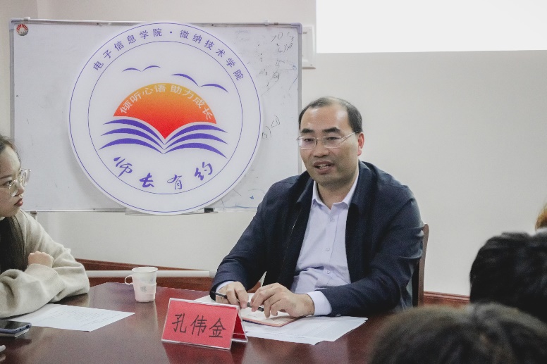 為聚焦營造“有溫度、有溫情、有溫暖、有溫馨”的育人環境和“成人、成才、成器、成事、成功”的育人目標,10月29日,電子信息(微納技術)學院開展以“青春話成長,引領新航向”為主題的“師長有約”活動。本次座談會邀請青島大學黨委常委、副校長孔偉金參加,由學院副書記李政主持,學工辦主任2019級輔導員徐蕾、2019級微納二班班主任姚釗和孔校長聯系的2019級微納二班全體同學參加活動。