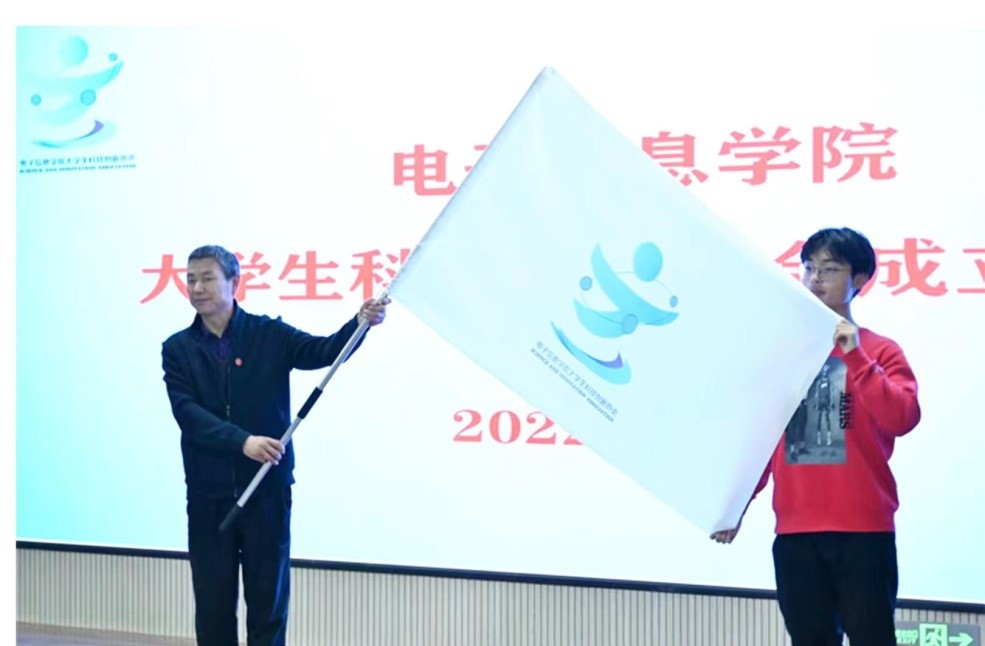 在啟動儀式上,劉孝群向我院大學生科技創新協會授旗。