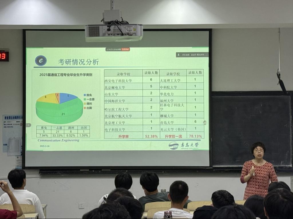 5月26日,通信工程系在博知樓210教室舉辦專場(chǎng)交流會(huì)。系主任李長(zhǎng)紅以詳實(shí)數(shù)據(jù)為基礎(chǔ),深度剖析近年考研錄取趨勢(shì),并依據(jù)歷年報(bào)考數(shù)據(jù),為學(xué)生精準(zhǔn)推薦了專業(yè)實(shí)力強(qiáng)、報(bào)考熱度高的目標(biāo)院校清單,助力科學(xué)擇校。交流會(huì)邀請(qǐng)2021級(jí)考研優(yōu)秀學(xué)子趙俊浩(山東大學(xué))、叢常祿(北京郵電大學(xué))、鄧文浩(大連理工大學(xué))、齊泓斐(中國(guó)海洋大學(xué))、秦嘉鑫(電子科技大學(xué))、王一諾(西安電子科技大學(xué)),圍繞備考策略、時(shí)間管理、心態(tài)調(diào)整、復(fù)試準(zhǔn)備及職業(yè)規(guī)劃展開細(xì)致分享,以親身奮斗經(jīng)歷為2022級(jí)學(xué)子注入信心與動(dòng)力。