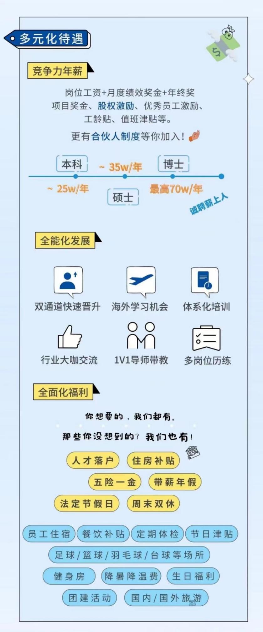 優于行業平均水平的薪資待遇,享受完善的養老保險、醫療保險、住房公積金等社會保障,享受政府配套人才引進政策,提供出國深造與在職研究生教育機會。
