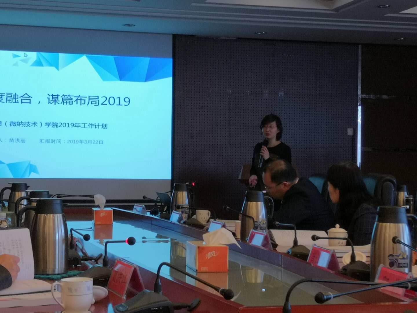 苗洪麗在《著眼深度融合,謀篇布局2019——電子信息(微納技術)學院2019年工作計劃》匯報中,側重從黨建工作與學院中心工作深度融合角度,匯報電子信息學院落實學院辦大學的工作思路和計劃。