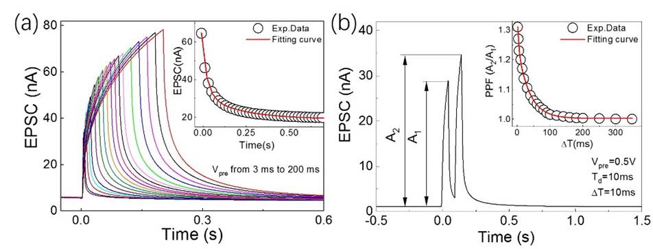 利用單個電子器件模擬神經(jīng)形態(tài)功能是當(dāng)前研究領(lǐng)域的一大熱點。傳統(tǒng)計算系統(tǒng)受限于馮諾依曼瓶頸的制約,在高速傳輸且大規(guī)模處理復(fù)雜信號時具有明顯的劣勢。人腦是一個具有1000億個神經(jīng)元和1000萬億個神經(jīng)突觸高度互聯(lián),且大規(guī)模并行的復(fù)雜網(wǎng)絡(luò),這種結(jié)構(gòu)使得它具有比傳統(tǒng)計算機具有更強健、更可塑、更容錯的記憶和學(xué)習(xí)功能。單福凱教授課題組將離子積累/弛豫過程和經(jīng)典場效應(yīng)晶體管特性相結(jié)合,成功制備了基于離子-電子耦合的金屬氧化物納米線突觸晶體管。該器件成功模擬了雙脈沖易化、高通濾波、脈沖時間依賴突觸可塑性等生物突觸行為。器件具有極低的功耗,單個突觸事件的能量消耗只有0.44 pJ,低于絕大部分三端突觸器件。這項成果為制備納米線突觸器件提供了新的思路。