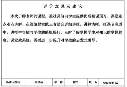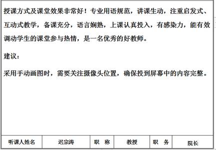 院長遲宗濤認為,任課教師準備充分,教學內容豐富全面,課程重點突出,課堂節奏較好,能夠引導學生自主學習,真正體現了以學生為中心。他表示,教師們授課時穿插的有關新冠肺炎疫情教育比較及時到位,能順利完成正常教學任務和疫情防控任務,學生到課情況良好,學習熱情較高,聽講認真,線上互動積極,教學秩序井然,營造了良好的教風和學風氛圍。