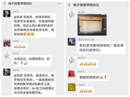 觀摩學習結束后,全院一線教師在微信群進行了討論交流,紛紛表示受益匪淺,黨委書記苗洪麗和院長遲宗濤對賀英老師在線教學效果給予充分評價,要求全院教師認真學習借鑒賀英教師的教學設計方法和組織授課技巧,提高網課質量。苗洪麗強調,教學工作是人才培養的根基,疫情防控期間,全體老師要克服困難,精心準備,全力投入,確保質量,不斷提高教育教學能力,確保線上線下教學實質等效。遲宗濤鼓勵老師們在疫情特殊時期,深入研究、完善在線教學方法,建立起以學生為中心、以教師為主導的交互式教學模式。關愛學生,抓好課程各項教學環節的落實,圓滿完成戰“疫”時期的教學任務。