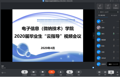 4月29日上午,電子信息(微納技術)學院使用“釘釘”軟件平臺召開了2020屆畢業生“云指導”考研就業視頻工作會,黨委書記苗洪麗、黨委副書記李政、院長助理宿杰、通信工程系主任李長紅、電子工程系主任遲潔茹、微納電子學系負責人鄭宇及畢業生輔導員、畢業生班主任和全體2020屆畢業生參加了會議,會議由正科級輔導員楊國慶主持。