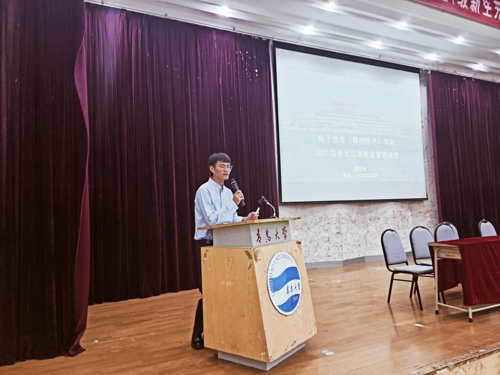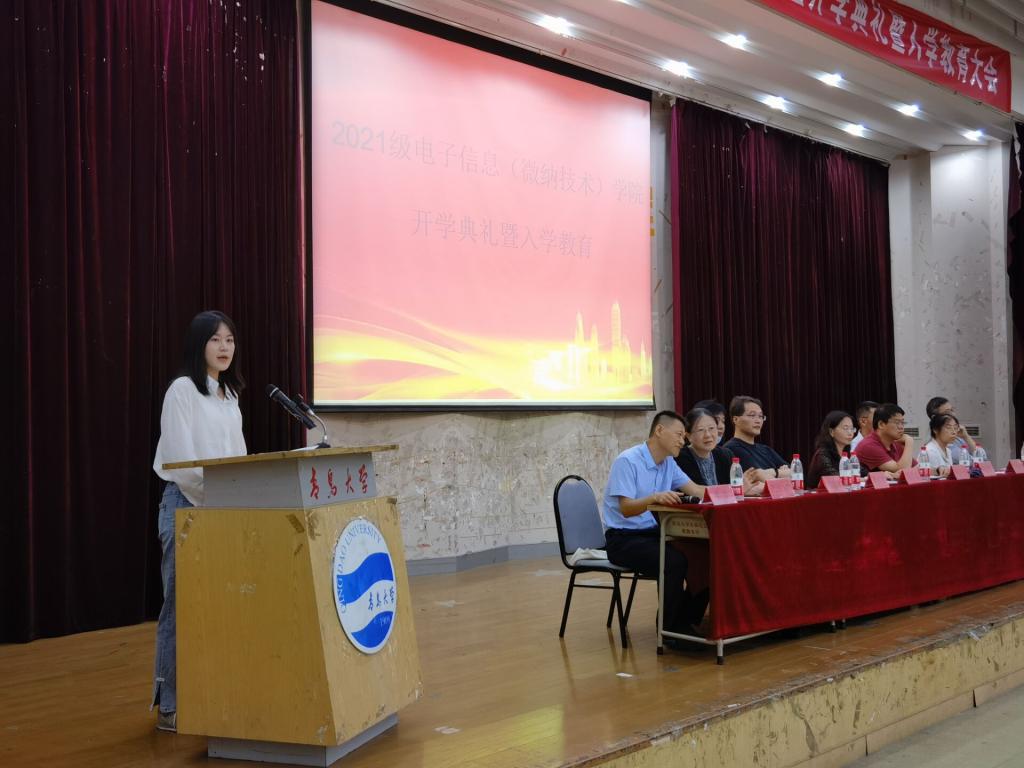 我院黨委書記苗洪麗代表全院師生,熱烈歡迎2021級全體新生的到來。她向新生介紹了學院的發展歷程與總體情況,她表示,電子信息(微納技術)學院是一個朝氣蓬勃、極具發展潛力的學院。她提幾點希望與大家共勉,一是守正創新、砥礪作為;二是勤勉務實、潛心躬行;三是內外兼修,健全品格。希望大家牢記囑托、不負韶華,在知識傳授、能力培養、素質提升、品格塑造的有機結合中始終追求“德才兼備、全面發展”,以不懈奮斗擦亮青春底色、叩響未來之門!