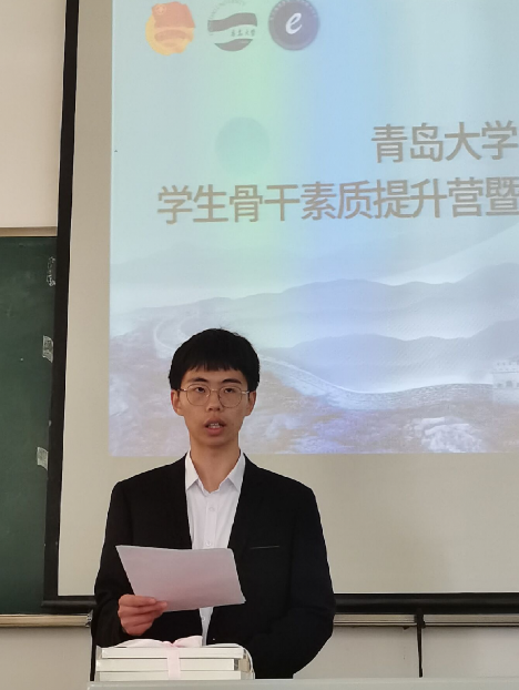 李政為全體學員介紹了本次青馬工程的籌備情況,并強調了學生骨干的帶頭作用。學院學生會主席張英豪作為學員代表進行交流發言。隨后校團委書記馬林剛、院黨委書記苗洪麗為學員代表贈書,領誓人帶領全體學員重溫入團誓詞。