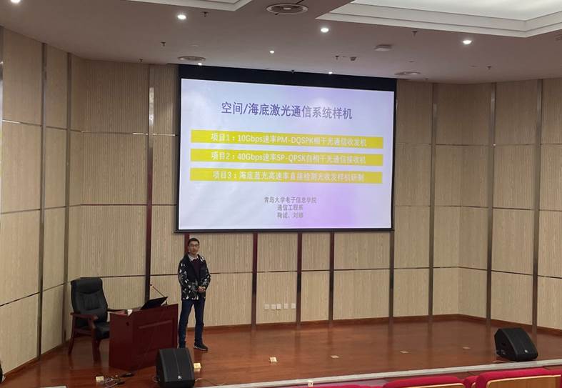 鞠誠老師畢業于北京郵電大學光研院,現工作于青島大學電子信息學院通信工程系,青島大學青年卓越人才,研究方向包括相干光DSP算法,FPGA、ADC等高速硬件處理板卡研發,空間激光通信精密光學跟瞄系統研發。鞠誠老師就自己的研究課題,為大家展示了青島大學光通信研究課題組自主研發的10Gbps速率PM-QPSK調制實時相干光通信系統。系統所用的全部硬件以及DSP算法完全是課題組自主研發,并且系統的可靠性與穩定性已經被若干高校和科研院所所檢驗。