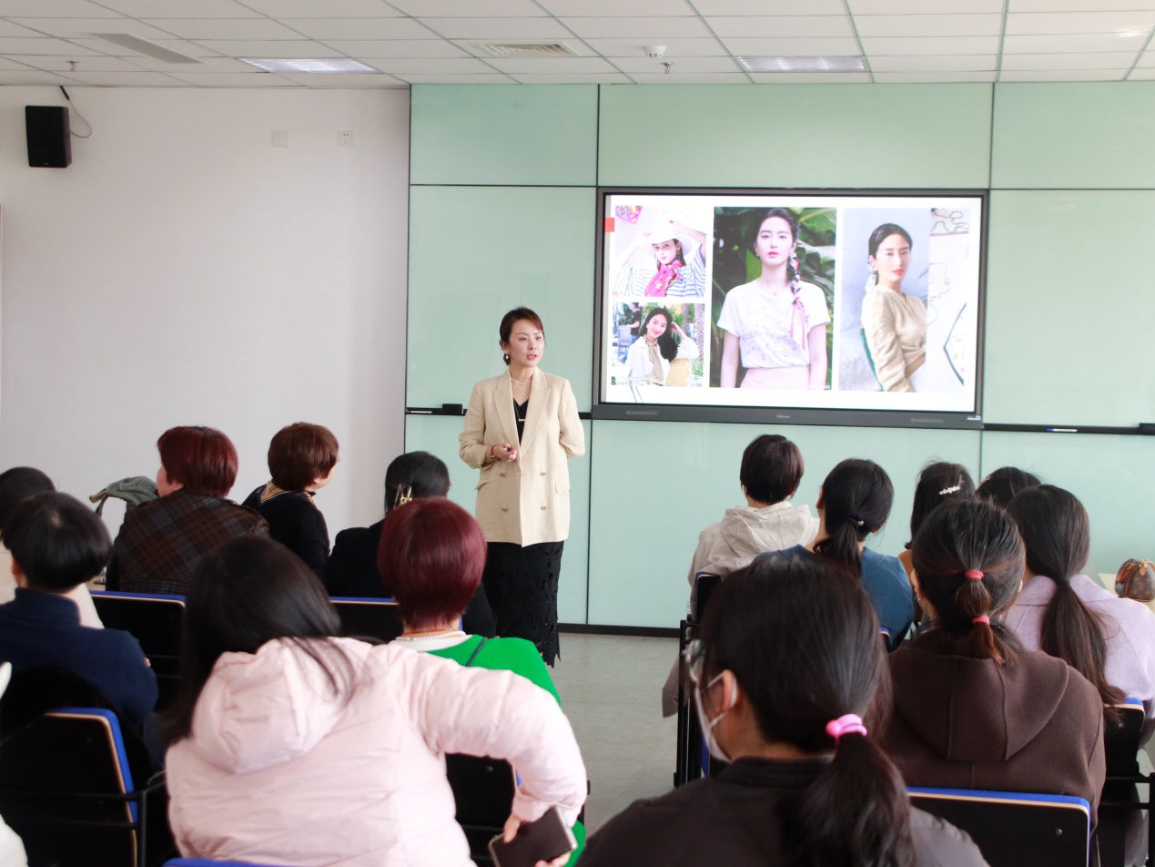 王鑫從外在形象的價(jià)值切入,與大家深入探討個(gè)人形象、氣質(zhì)與工作機(jī)遇、個(gè)人發(fā)展之間的關(guān)系,強(qiáng)調(diào)“美”不僅能夠讓人自信,更是一種約束力,使人變得更加自律。她針對高校女教師群體所屬的知識分子特性,針對性地從著裝、配飾、化妝等方面提供形象建議,并于在場的老師進(jìn)行積極互動(dòng),現(xiàn)場氣氛十分活躍。
