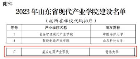 近日,山東省教育廳、山東省工業和信息化廳公布了2023年山東省現代產業學院建設名單,我院申報的“集成電路產業學院”獲批立項,這是青島大學繼海信人工智能學院、現代紡織產業學院之后獲批的第三個省級現代產業學院。