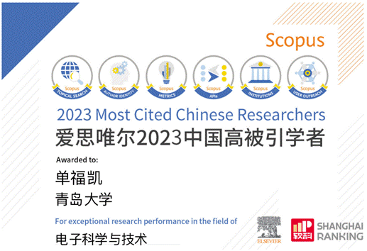 2024年3月27日,愛思唯爾(Elsevier)正式發布2023“中國高被引學者”(Highly Cited Chinese Researchers)榜單,我院單福凱教授入選電子科學與技術學科榜單,這也是單福凱教授連續第三次入選高被引學者榜單。